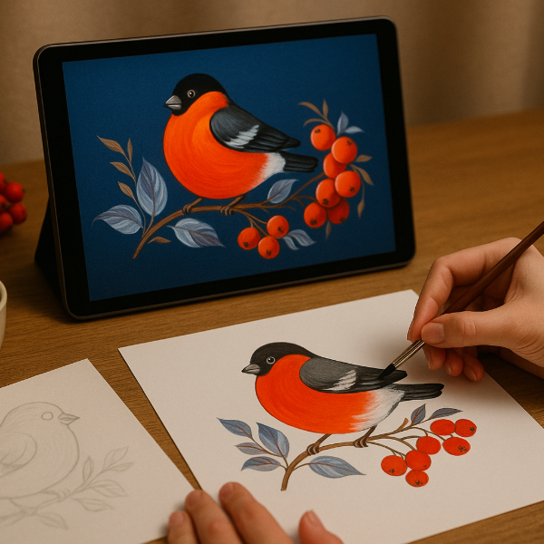 Ка нарисовать сюжет для декора новогодних сувениров и нарисовать снегиря и на веточке рябины